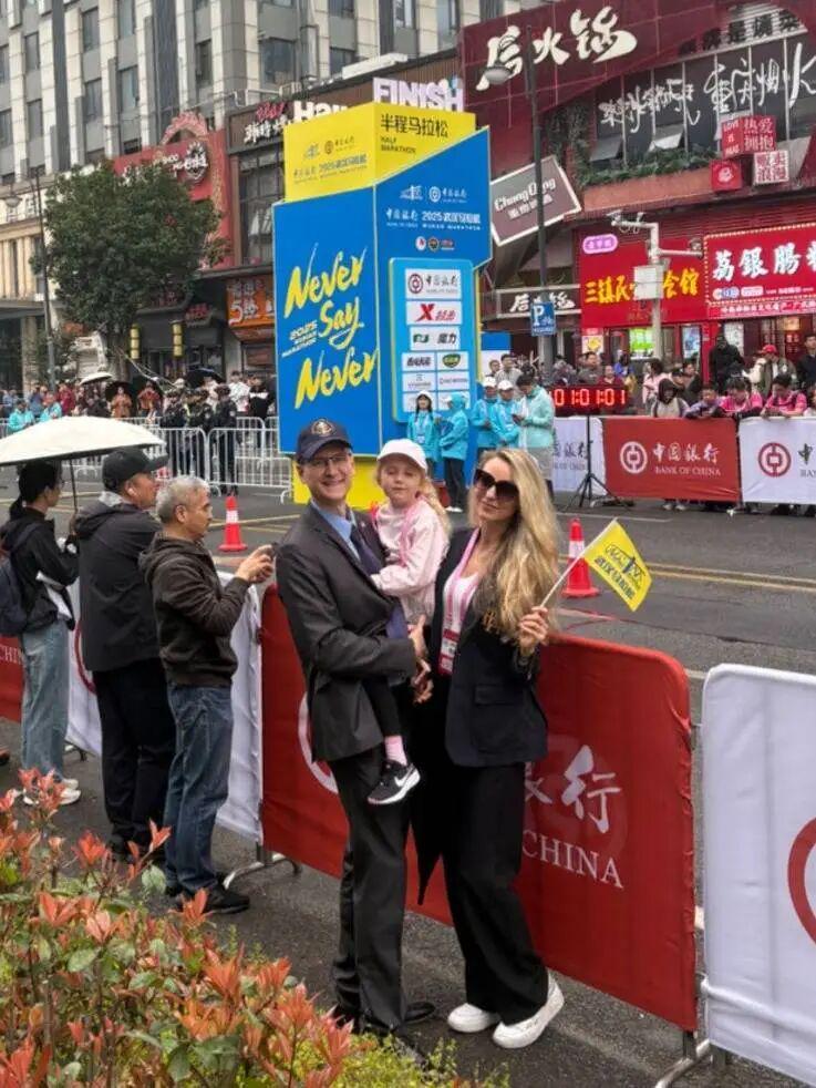 2025年3月23日,武汉马拉松半马终点处,美国驻武汉总领事柯儒思与夫人、女儿一同为参赛选手加油助威。(来源 长江日报)