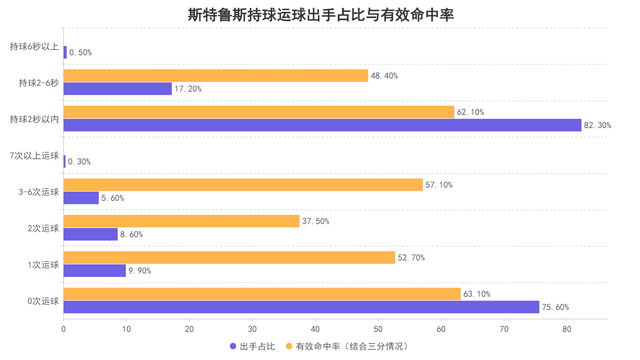 上赛季的斯特鲁斯除了中投几乎没有外,在各个区域的得分受助攻率都显著的大于非助攻率,因此他是一名较为依赖队友为他创造空切篮下与三分线外投射机会的球员,而无论是哪个区域的三分球他都较为均衡没有明显的低效区。